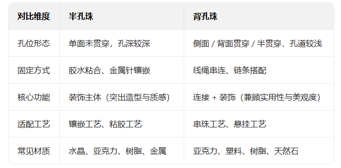 在饰品配件行业中,“半孔珠”与“背孔珠”是高频出现的基础术语,也是DIY创作、批量采购中较常用的核心配件。这两种珠子因开孔方式不同,在结构、固定方式和应用场景上存在显著差异,不少新手采购者或创作者常因混淆孔型导致适配失误。本文将详细解析二者的定义、结构特点,并结合实际场景说明其适用范围,帮助行业从业者与爱好者精准选型。